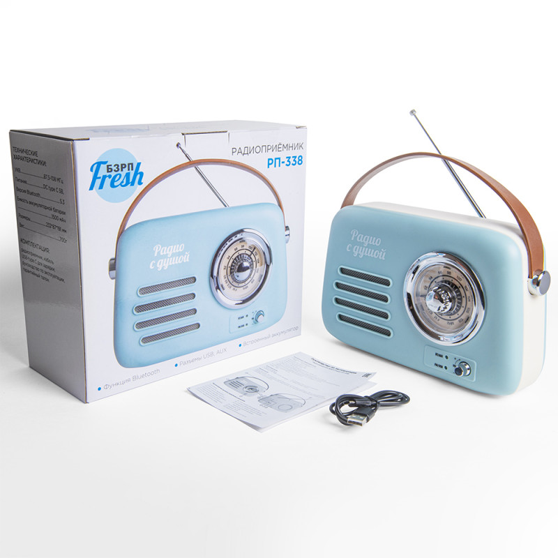 БЗРП Fresh РП-338 – радиоприемник в голубом цвете. На фасаде имеется запоминающаяся надпись. Свой ретро внешний вид радио сочетает с современными функциями внутри.