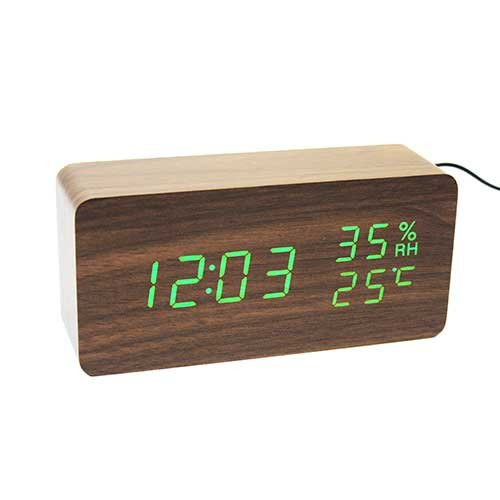 Электронные часы в таком оригинально исполненном корпусе идеально впишутся в интерьер любого дома или офиса. Имеют яркое свечение светодиодных цифр проецируется через панель, имитирующую дерево. Также отображают время, дату, температуру и влажность воздуха в помещении, что очень удобно и практично. Функция будильника. 3 кнопки для настройки и управления часами.
