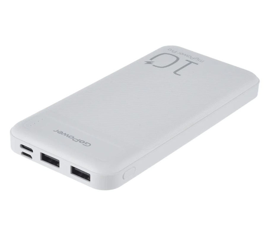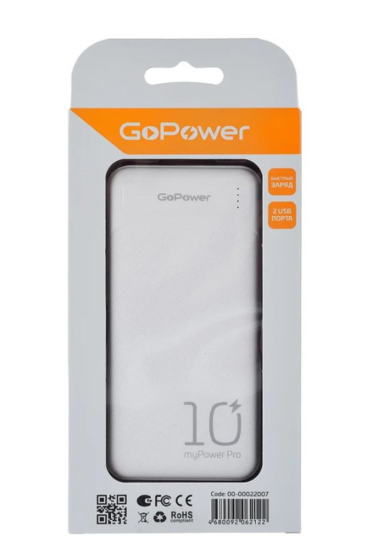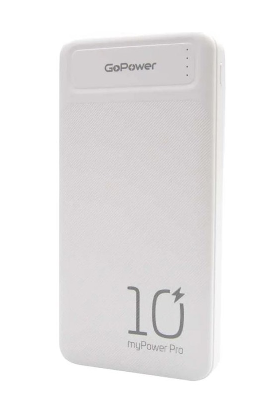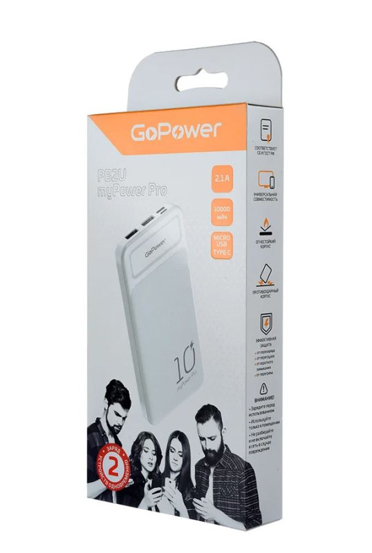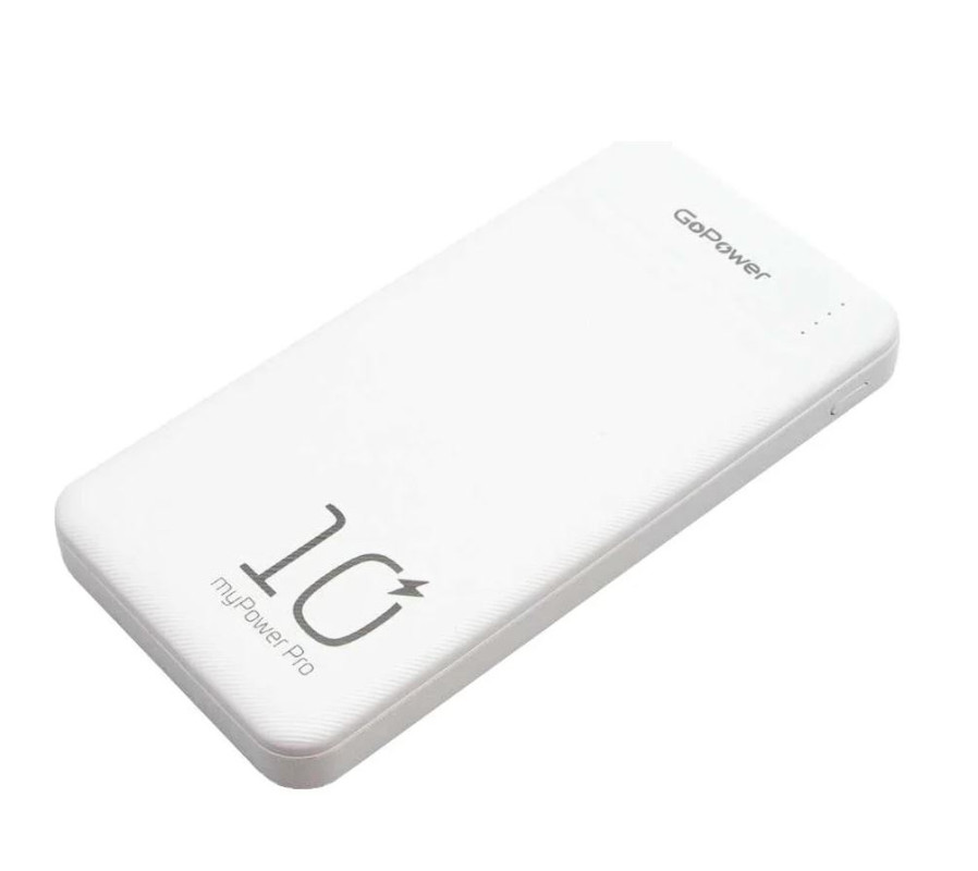Внешний аккумулятор 10000mAh GoPower PB2U (in - T,M/out - 2U) белый выполнен в огнестойком противоударном корпусе. Поддерживает заряд 2 устройств одновременно, максимальный ток 2,1А. Заряжается с помощью разъёмов Type-C и micro-USB. Подходит для любых смартфонов, планшетов, умных устройств.