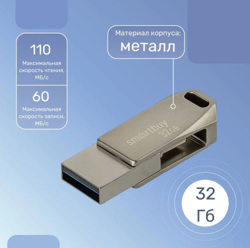 USB-накопитель SmartBuy MC35, оснащенный 2-разъемами (USB-A и USB-C), позволяет легко переносить файлы между различными устройствами. Поддерживает интерфейс USB3.0.