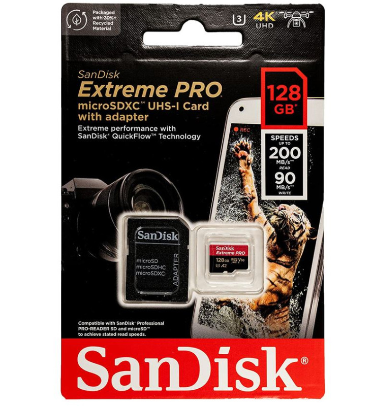 Карта памяти microSDHC SanDisk 128Gb ExtremePro A2, V30, U3 200MB/s с адаптером обеспечивает исключительно высокую скорость для быстрой передачи данных, работы приложений и видео в формате 4K UHD.2 Эта высокоскоростная карта Extreme Pro microSD SDXC, идеальная для смартфонов на базе Android™, экшн-камер и дронов, записывает видео в формате 4K UHD, поддерживает видео Full HD и фотографии с высоким разрешением. Сверхбыстрая карта памяти SanDisk Extreme PRO microSDXC™ читает данные со скоростью до 200 МБ/с8 и записывает со скоростью до 90 МБ/с.8 Кроме того, она имеет класс скорости A2, благодаря чему приложения будут работать быстрее и пользоваться смартфоном станет еще удобнее.5