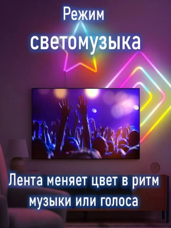 Синхронизация с музыкой – лента может светиться в ритм ваших любимых треков, создавая эффектное шоу! Множество режимов свечения (мерцание, плавные переливы, статичный свет и другие) позволят подобрать идеальный вариант под любое настроение.