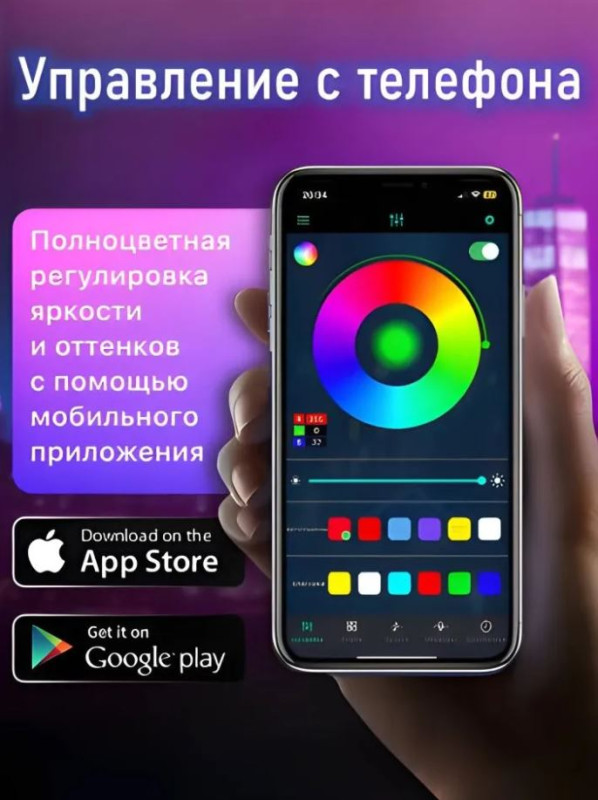 Многоцветное свечение с возможностью выбора любого оттенка из палитры. Управляйте цветом и режимами с пульта в комплекте или прямо из приложения на телефоне – легко и удобно!
