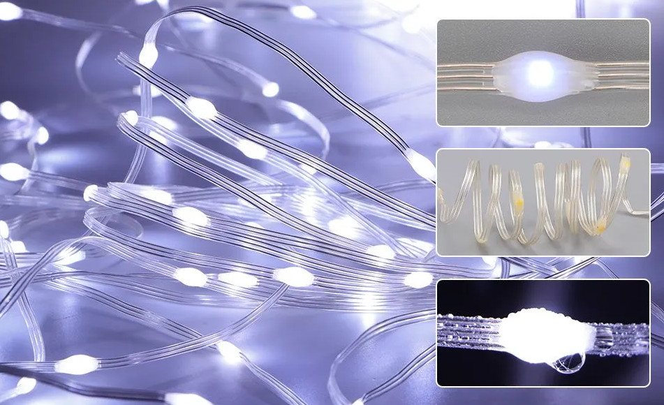 Светодиодная гирлянда безопасна, так как при постоянном свечении лампочки не нагреваются и при этом расходуется минимум электроэнергии. Имеет гибкий провод.