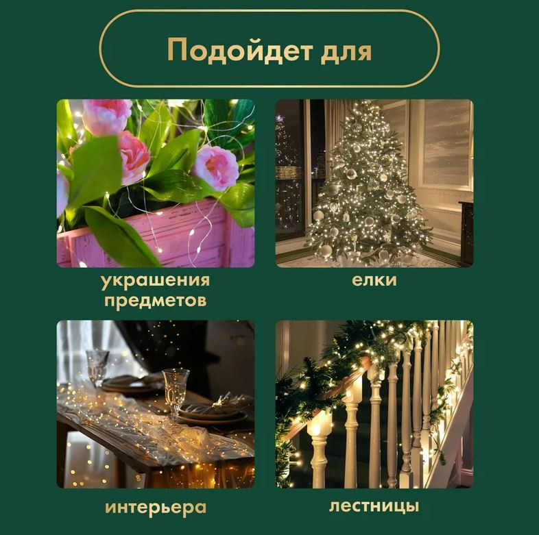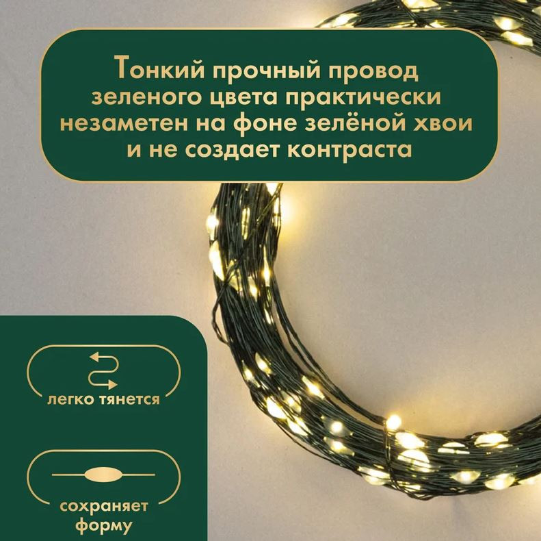Предназначена для декоративной подсветки на улице: крыльца, деревьев, елки, интерьера. Теплый белый цвет - отличный выбор для уютного освещения с ноткой волшебства. Провод тёмно-зелёный проволочный, гибкий. 50м и 8 режимов работы. Кнопка управления режимами находится на блоке, работает от вилки, напряжение элементов питания 220В.