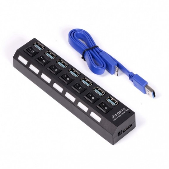 Компактный 7-портовый USB 3.0 хаб с выключателем для каждого из портов со съемным кабелем.