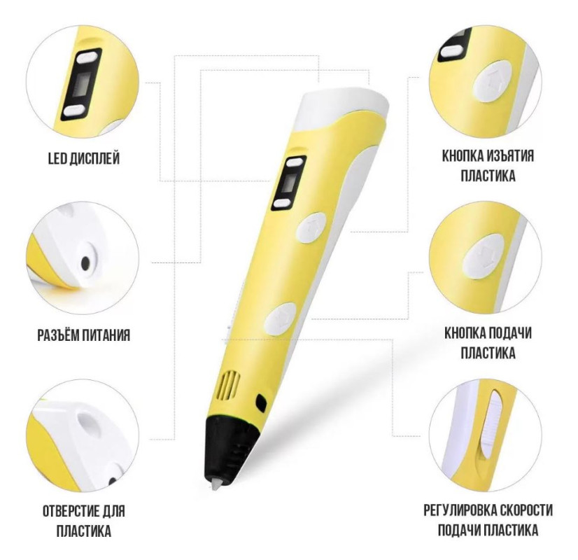 3D-ручка c LCD дисплеем может использоваться для создания объемных рисунков на плоскости либо для моделирования трехмерных объектов. Принцип ее действия основан на расплавлении пластика с последующей подачей через узкое сопло – при контакте с воздухом он застывает, приобретая твердую устойчивую структуру.