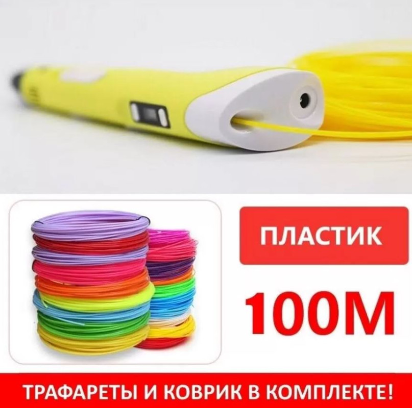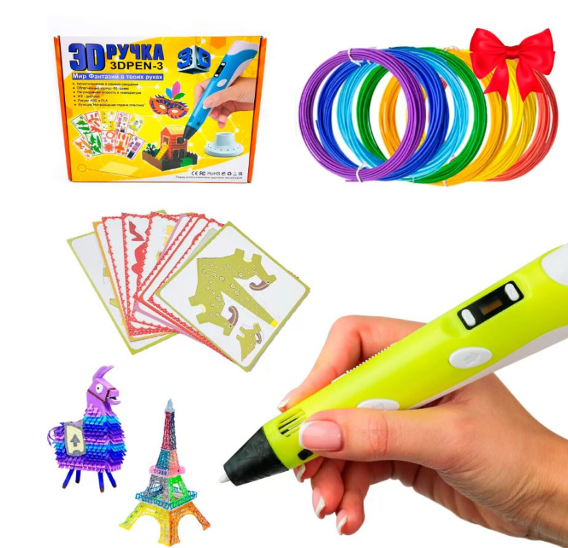 Комплектация: Подарочная упаковка ,3D ручка, раковинка для ручки, набор пластика из трех разных цветов , кабель энергопитания и в подарок набор трафаретов разных рисунков.