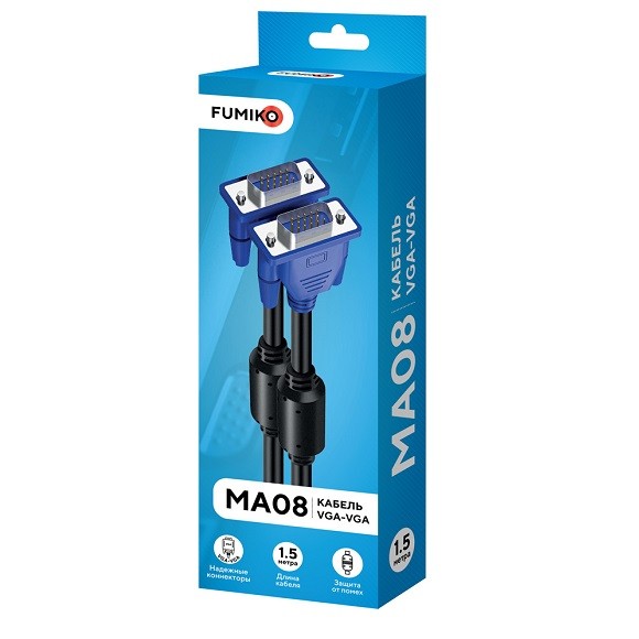 VGA (D-Sub) — один из самых популярных разъемов за всю историю цифровой техники. D-Sub (D-subminiature) представляет собой аналоговый пятнадцатиконтактный разъем. Как правило, он используется для подключения компьютера или ноутбука к монитору. Кабель FUMIKO MA08 позволят подсоединить установленные далеко друг от друга компьютер/ноутбук и проектор/монитор. Преимущество продукта - ферритовые фильтры, предотвращающие искажения цифрового видеосигнала, передаваемого по длинному проводу. Качественные материалы оплетки шнура и коннекторов продлевают срок службы.