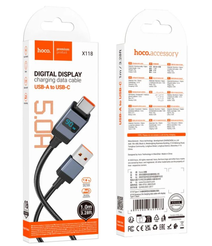 Кабель HOCO X118 — это современный USB-кабель с поддержкой быстрой зарядки и передачи данных. Кабель выполнен в стильном черном цвете и оснащен специальным дисплеем для отображения мощности зарядки в реальном времени.