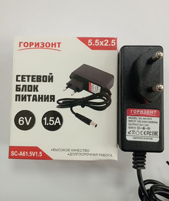 Блок питания Горизонт 6V 1.5A = 1.5A (5.5*2.5) SC-A615V5 подходит для различных тонометров (убедитесь, что вольтаж и ампераж, а также размер штекера соответствует Вашему прибору). Работает от стандартной сети 220В. Блок выдаёт выходное напряжение 6V, выходную силу 1,5А.