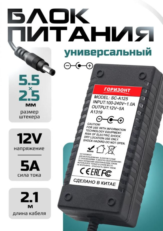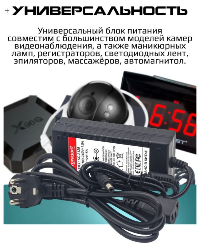 Блок питания Горизонт 12V 5A = 5A (5.5*2.5) SC-A125 подходит для цифровых приставок с соответствующими характеристиками. Также данный блок предназначен для работы устройства от сети, например: роутеры, компьютерные модули, видеокамеры, маникюрные лампы, инструменты и другие устройства или для заряда аккумуляторов в устройствах где есть встроенный АКБ.