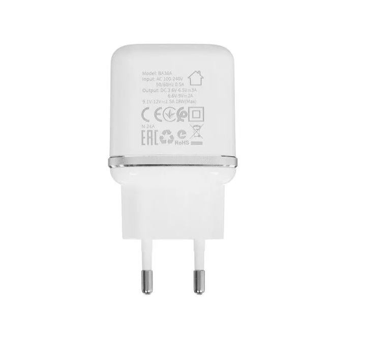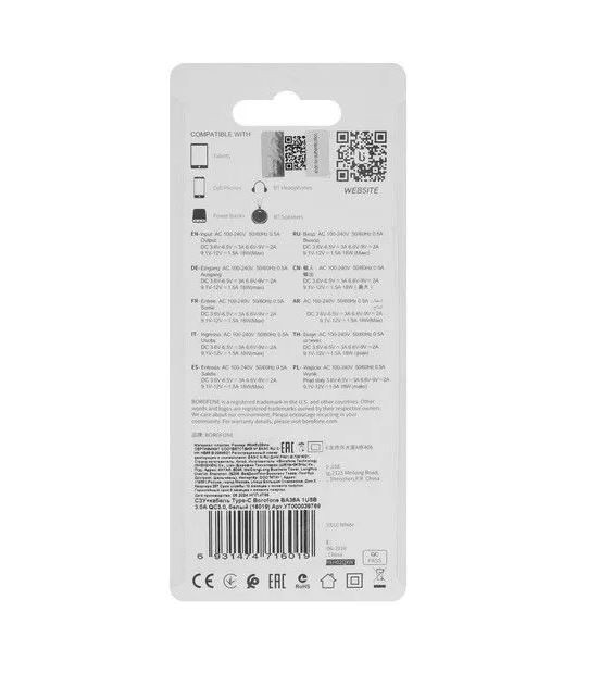 Borofone BA36A High Speed –сетевое зарядное устройство, которое поддерживает многие актуальные стандарты быстрой зарядки: Quick Charge (QC) версии 3.0 и 2.0, Fast Charge (FCP) и Super Fast Charge (SCP), Adaptive Fast Charging (AFC). Благодаря этому зарядка совместимых моделей смартфонов занимает меньше времени. Кроме того, оно выполнено в компактных размерах и мало весит. Такой адаптер питания удобно носить при себе: он не займет много места в сумке или рюкзаке. Широкий диапазон входного напряжения позволяет использовать его во многих странах мира. А также эта модель оснащена многоуровневой системой защит, чтобы процесс зарядки был не только быстрым, но и безопасным. В комплекте к зарядке идет кабель с коннектором USB Type-C на одном конце и штекером USB на другом.