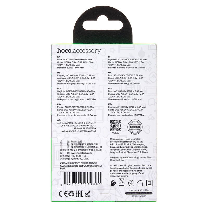 Сетевое зарядное устройство Hoco CS21A - компактный адаптер питания, который подойдет для подзарядки мобильных устройств. Модель заменит собой штатный зарядный блок при его утере или поломке, благодаря чему вы сможете продолжить пользоваться вашим смартфоном. Конструкцией сетевого зарядного устройства Hoco CS21A предусмотрен порт USB Type-A, который позволит заряжать мобильное устройство при наличии подходящего кабеля. Выходная мощность адаптера питания равняется 18 Вт.