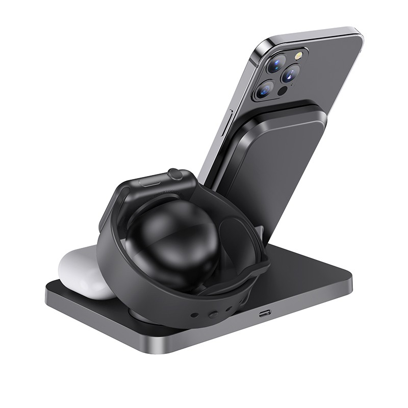 Беспроводное зарядное устройство позволит вам одновременно заряжать смартфон, смарт - часы и наушники, поддерживающие протокол беспроводной зарядки QI. Максимальная выходная мощность 15 Вт. Корпус выполнен из высококачественных материалов. Для питания зарядного устройства предусмотрен входной разъем Type-C.